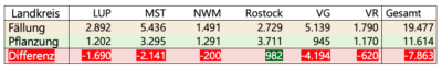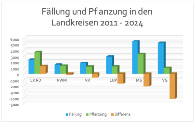 Seit 2011 haben die Landkreise rechtlich die Verantwortung für die Nachplanzungen der Alleen übernommen. Sie nehmen diese Aufgabe nur sehr unzureichend wahr, denn nachweislich standen bis 2024 den 19.477 Fällungen nur 11.614 Pflanzungen gegenüber. Vorpommern-Rügen ist dabei leider keine rühmliche Ausnahme. Im letzten erfassten Jahr 2024 fällt die Landkreisbilanz desaströs aus. 1.022 Fällungen standen nur 185 Neuanpflanzungen gegenüber. Dabei ist die rechtliche Lage klar definiert. Um den Alleenbestand zu sichern, müssen in ausreichendem Umfang Neuanpflanzungen